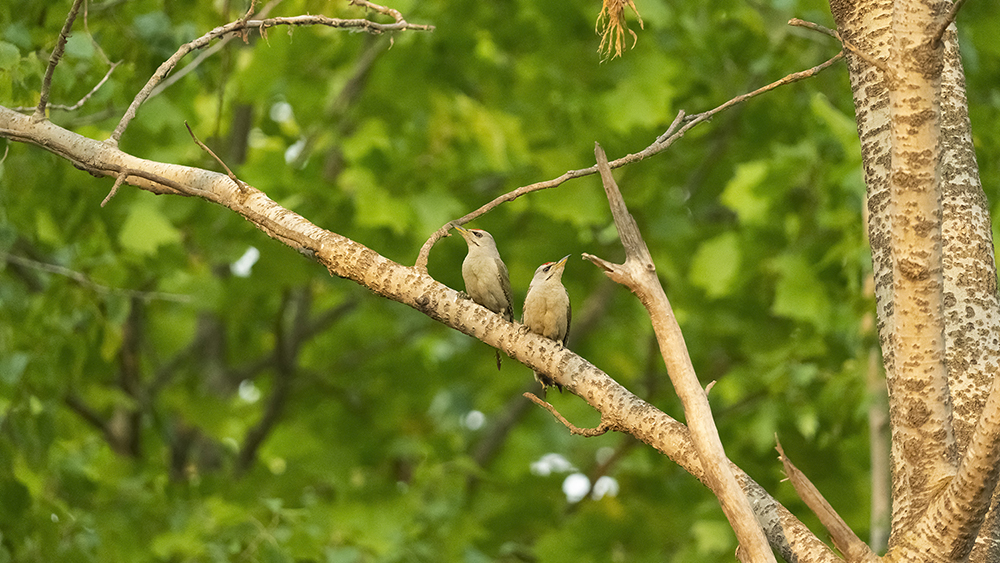 · 与“笃笃笃”猛烈敲击树干的大斑啄木鸟不同,灰头绿啄木鸟的啄木声相对较轻、较稀疏。它们更多是用喙撬和凿,而不是高速敲击。